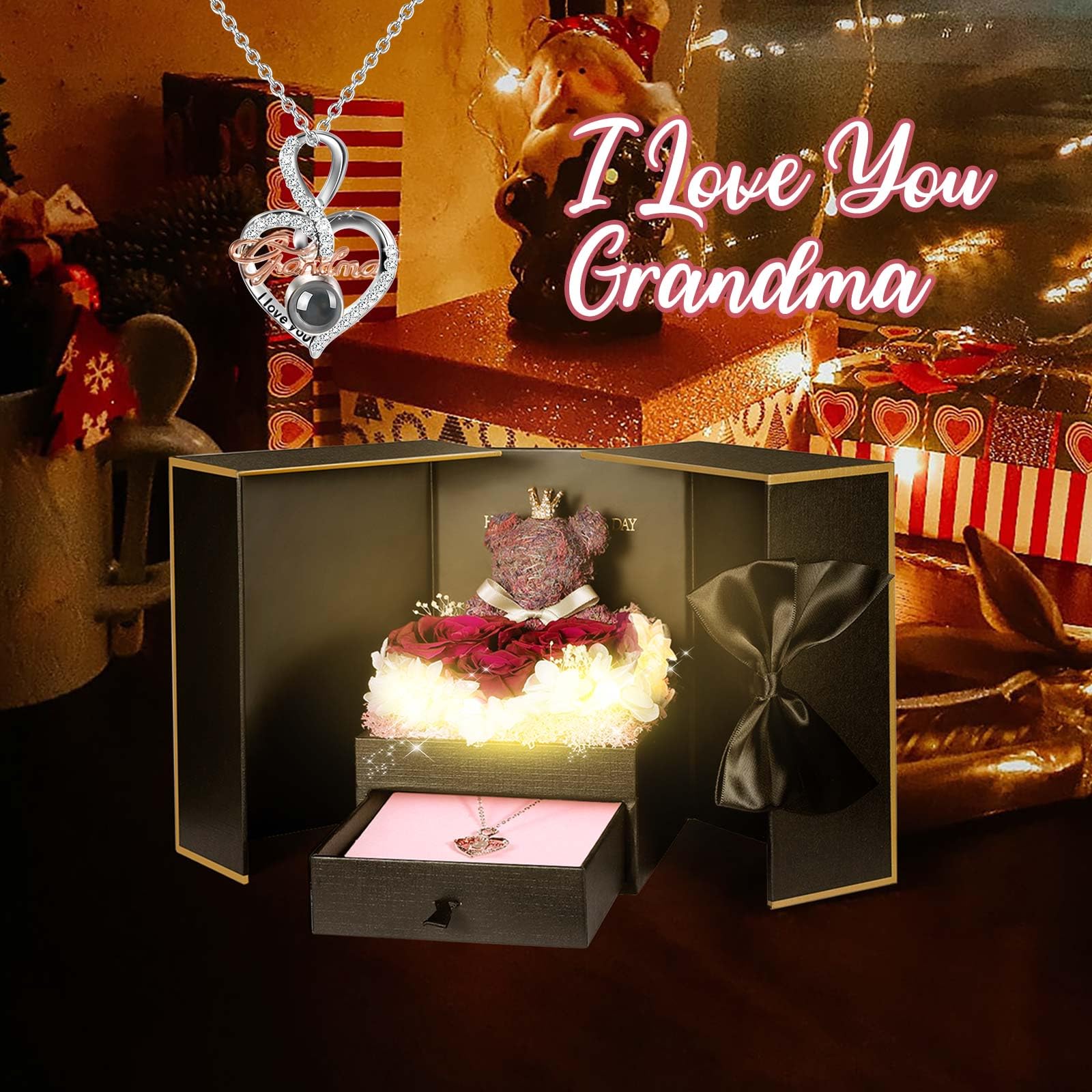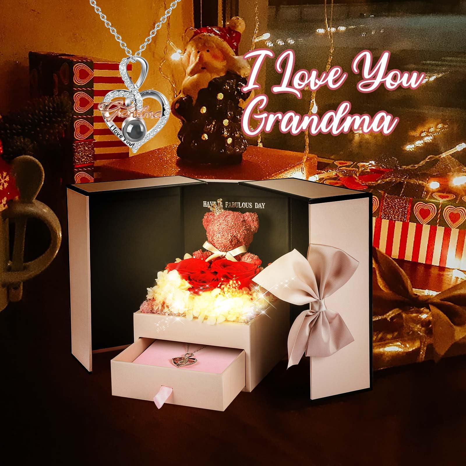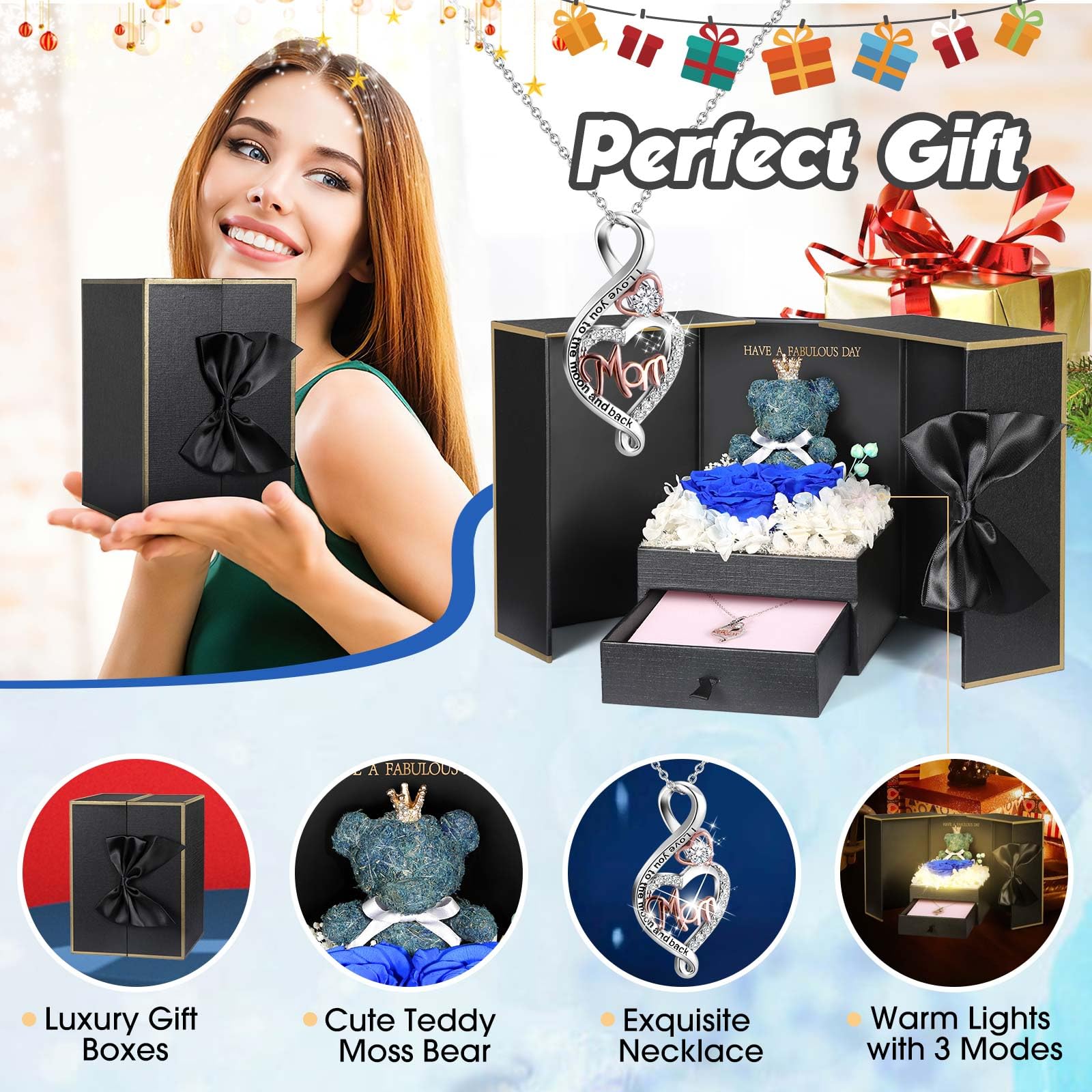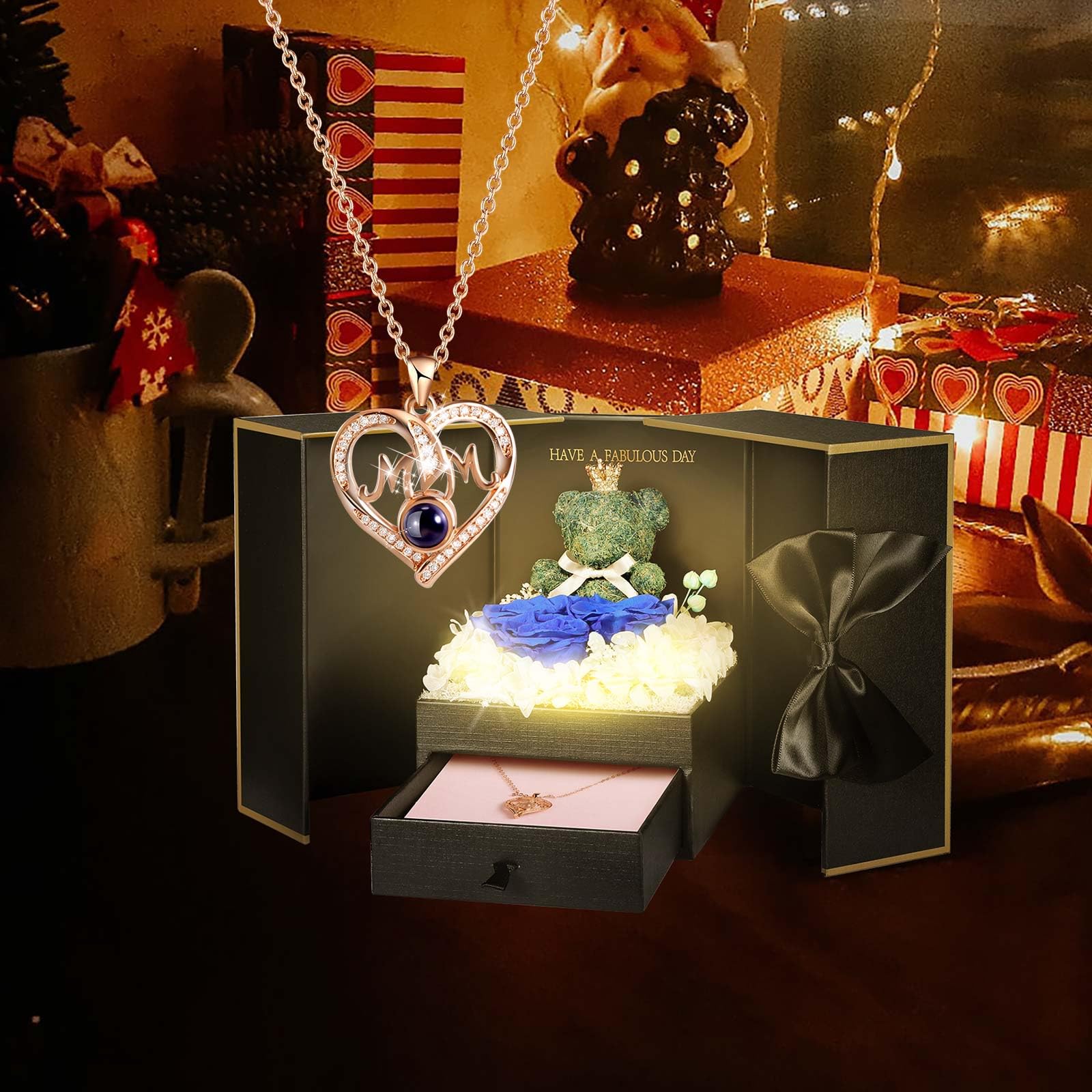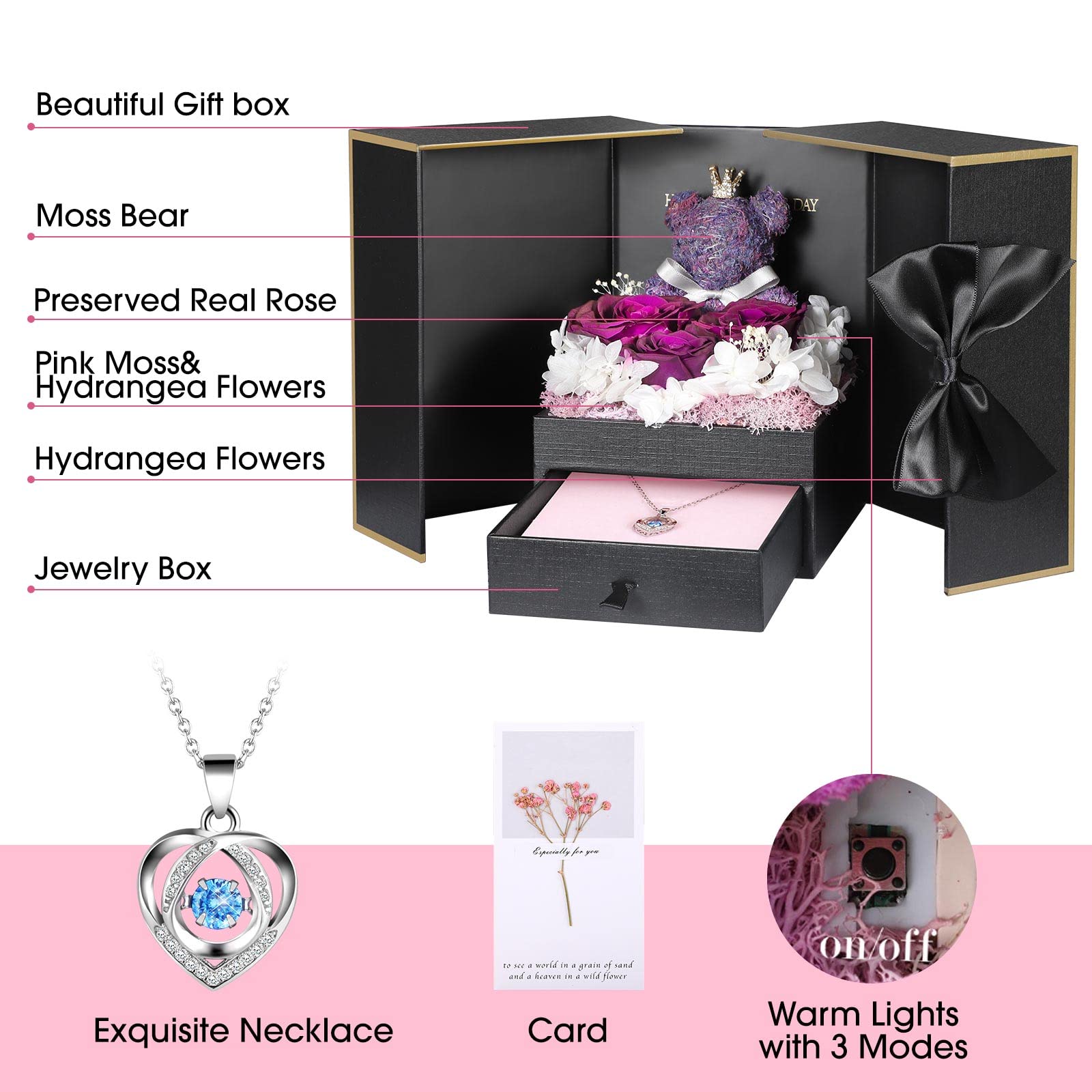 ADDWel Rose Gifts for Women Birthday Christmas - Preserved Real Roses Forever Red Flowers with I Love You in 100 Languages Necklace and Cute Moss Bear for Girlfriend Wife Mom Grandma