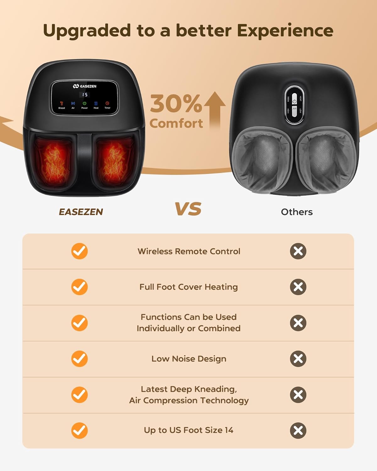 - 【ONE FOOT MASSAGER FOR WHOLE FAMILY】With its enlarged foot rooms, EaseZen【 2025 Upgraded】electric foot massager for plantar fasciitis and can accommodate almost all foot sizes up to men size 14 , the whole family can enjoy a total relax foot massage at home.