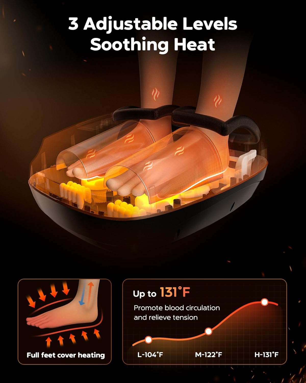 - 【UPGRADED HEATED FOOT MASSAGER】Our foot massager is upgraded with full foot cover heating function and 3 heating level(104-122-131°F). Unlike other foot massager that only provide foot bottom heating, our foot massager provides targeted soothing heat to the entire foot, sole and instep. This foot massager can quickly heat up to 131°F(55°C), helps to improve blood circulation, maintain muscle or skin vitality, and work as a foot warmer in winter.