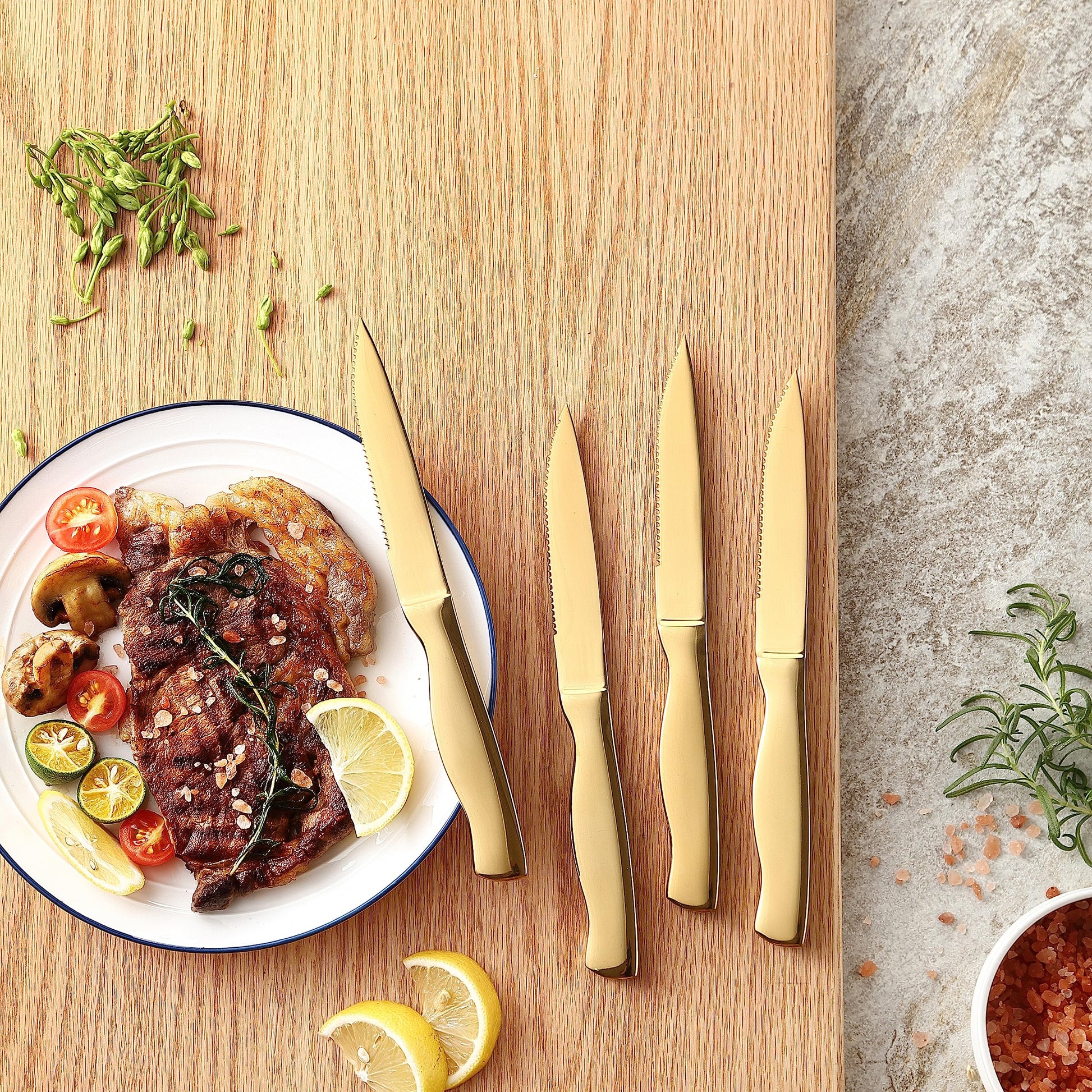 - 【Value Knife Set】15 pieces restaurant-grade precision knife set with block includes knives suitable for various cooking tasks: 8" chef knife, 8" slicing knife, 5" santoku knife, 5.5" serrated utility knife, 5" fine edge utility knife, 3.5" paring knife, 6pcs 4.5" serrated steak knife, 2 pairs of kitchen shears, and hard wood knife block with built-in sharpener. This razor-sharp knife set slices tomatoes paper-thin & bones chicken effortlessly. The variety of knives can cover all cooking needs, great for everyday use.
