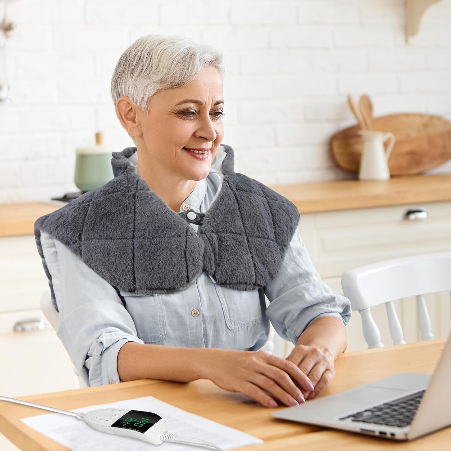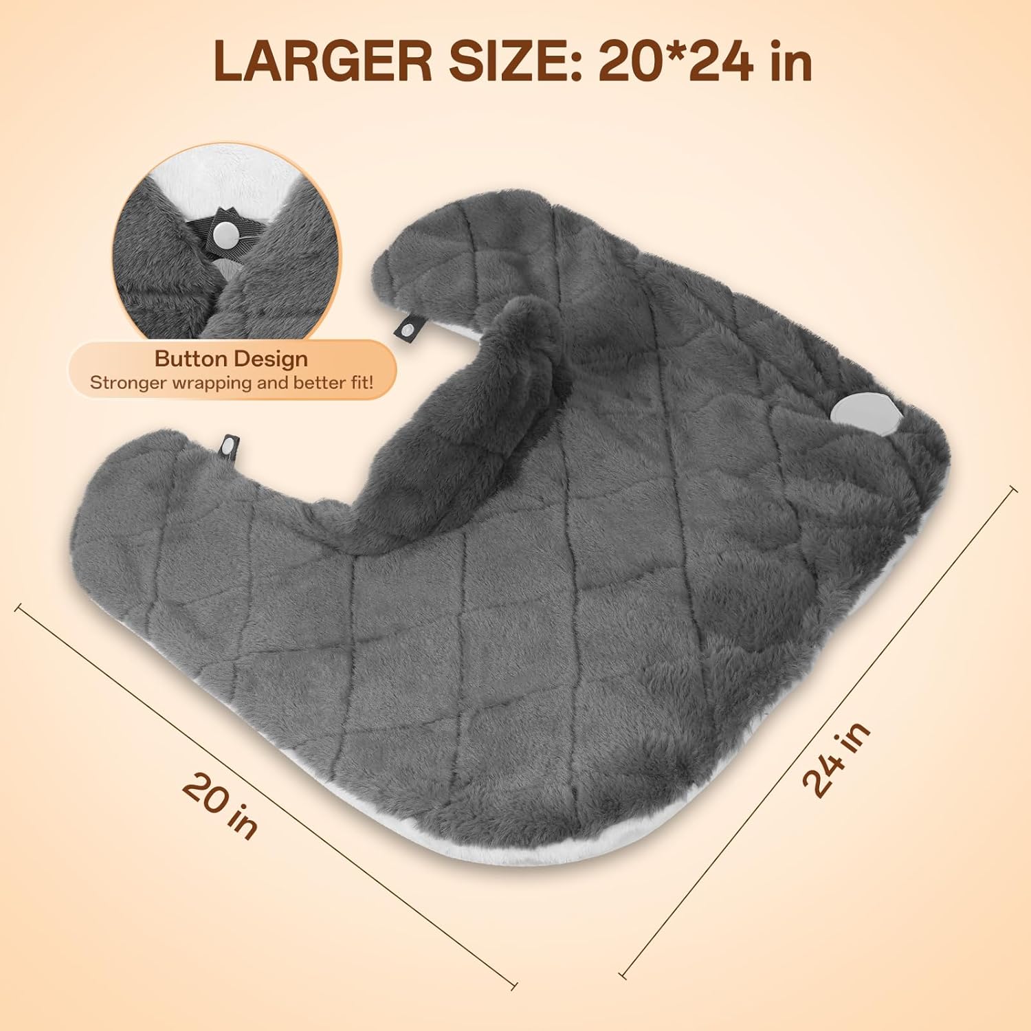 - Large Size Neck and Shoulder Heating Pad: The size of 24"x 20" can cover more of your neck, shoulders, and upper back area, meeting the needs of M and L size users. The button design on the front makes the heating pad more enveloping and provides you with comprehensive warmth