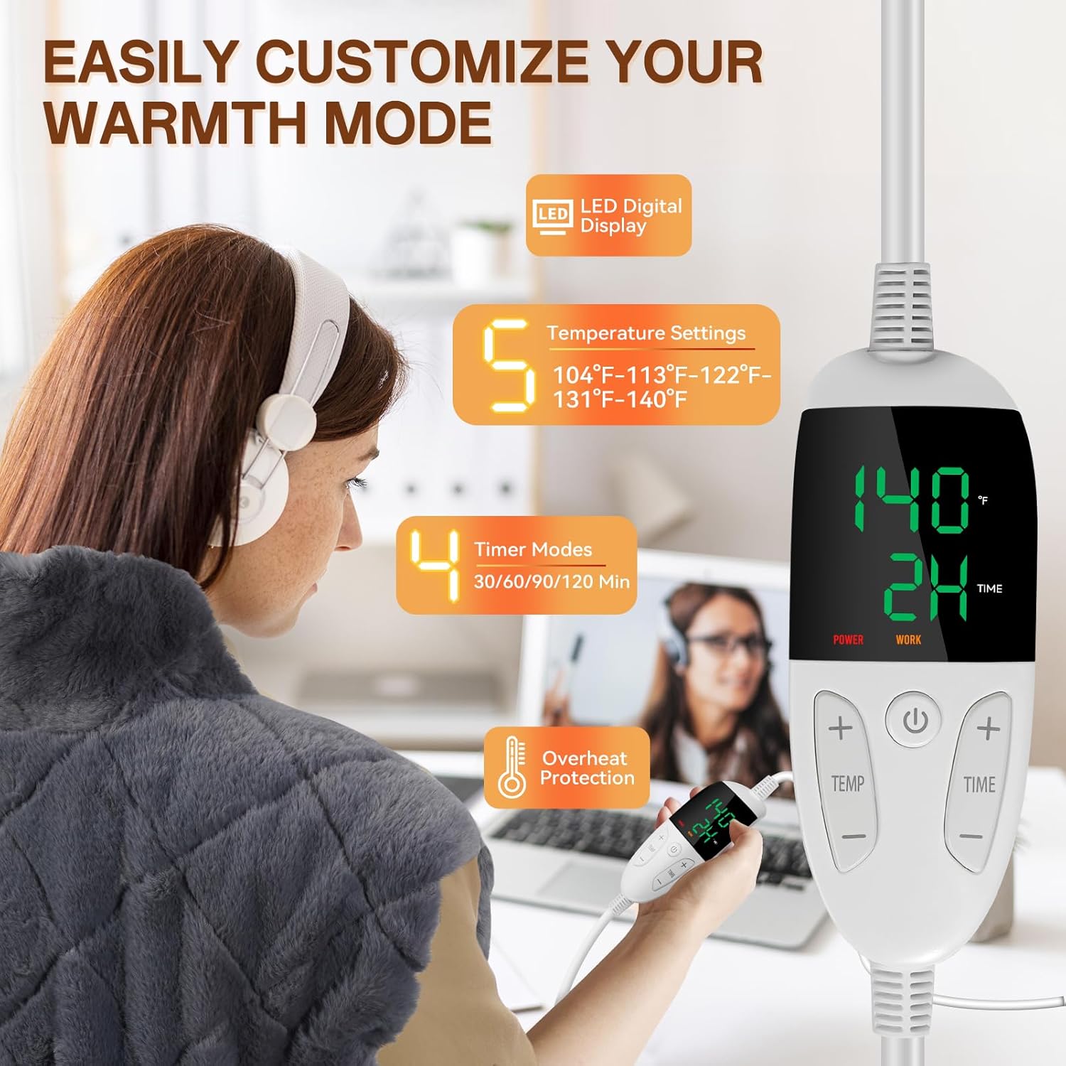 - Smart Controller: Provides 5 heat settings (40℃-60℃ / 104 °F-140 °F), 4 auto-off timers (0.5H, 1H, 1.5H, 2H). With LED digital display and overheat protection function, you can customize your own heating mode safely and worry-free