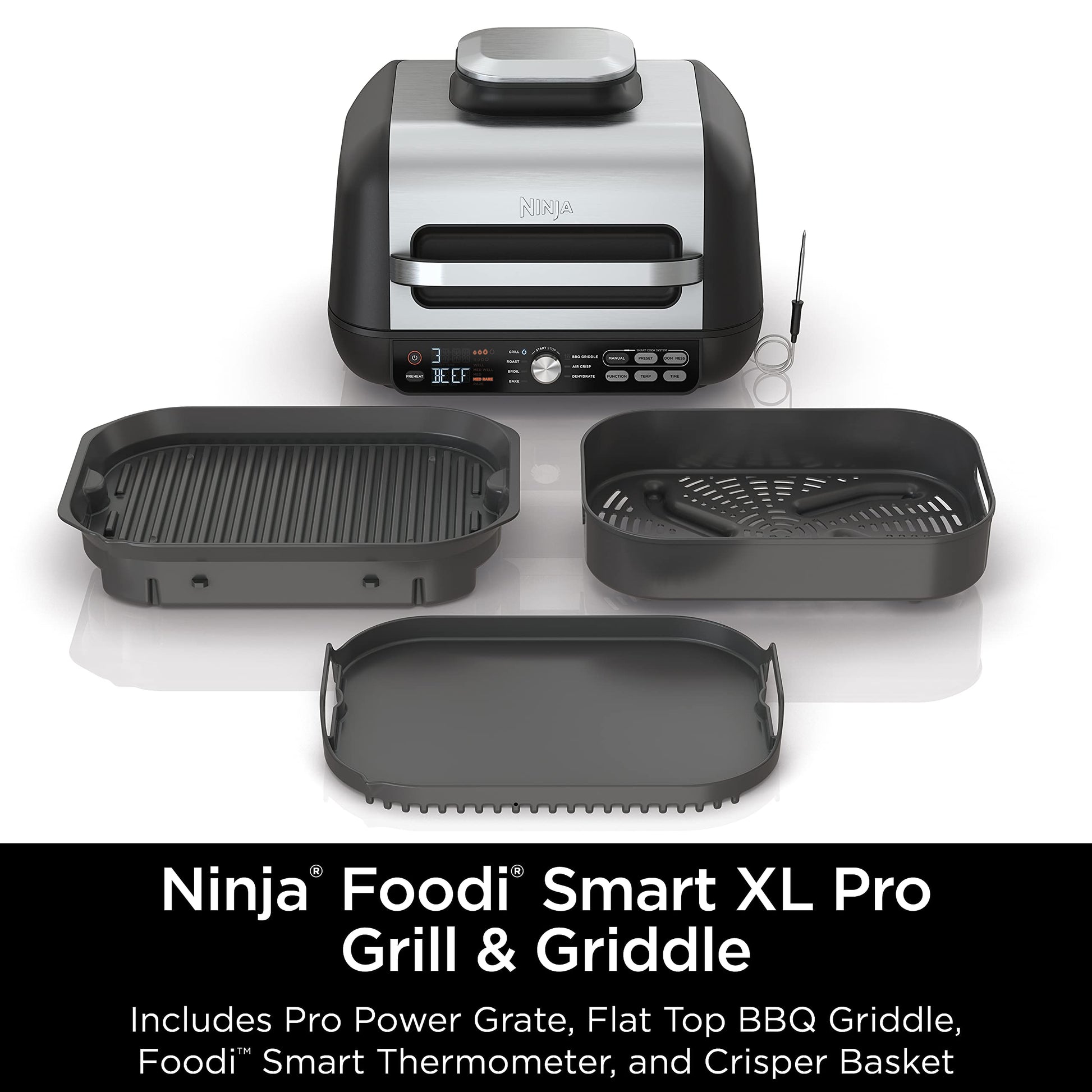 - WHAT’S INCLUDED: Ninja Smart XL Grill, 9" x 12" Grill Grate, 4 qt. Crisper Basket, 4 qt. Cooking Pot, Foodi Smart Thermometer, Cleaning Brush and Chef Created 15 Recipe Book.