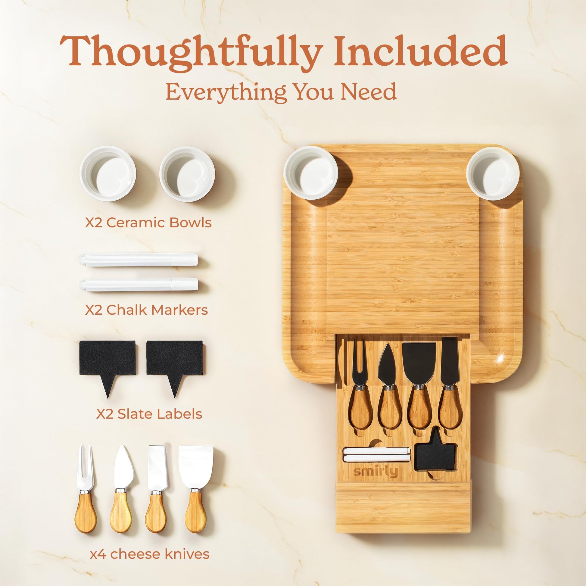- Stylish Housewarming Gift - SMIRLY’s unique cheese board set is the perfect gift for couples, new homeowners, apartment dwellers. With a decorative box and useful accessories, it’s a thoughtful and timeless prensent.